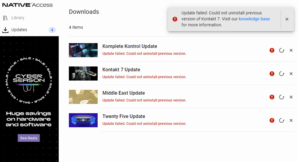 I have posted regarding this issue previously but to no avail. I am waiting for a reply to a submitted ticket but am a little frustrated. I have tried every suggestion, both from the NI help pages and any other sources I could find. I attempted to uninstall Kontakt factory Library from my PC via add/remove programs in Windows 10 64bit. I received a message that there was a problem, and that the item in question may have already been uninstalled!. This was definitely my first attempt to do this. I did find at this point that the Kontact Factory Library folder was still in C/users/public/documents, and after advice on the NI facebook page I deleted it, along with 2 other folders from regedit, then restarted my PC as advised. I also tried the registry uninstall tool but there were no entries for the Library for obvious reasons. On opening Native Access, sure enough, the Kontakt Factory Library was in the available section and ready to download. However the download failed with the message that Native Access could not locate and uninstall the previous version!!. It has now gone full circle, with the advice to use the registry tool, which now resolves nothing. This was all because I had purchased an external expansion drive to put all the big libraries on to free up space on drive C. It works fine, as I have uninstalled numerous other libraries and moved to the new drive, and they all work fine. It is just this one Library. I am assuming something remains on my PC that is causing this issue but I have no idea what to look for. I performed both SFC and DISM and it would appear that there are no Windows issues, as I am usually very careful. I apologise for the length of this post but wanted to make sure I left no details out. If anybody has any alternative suggestions I would be very grateful.