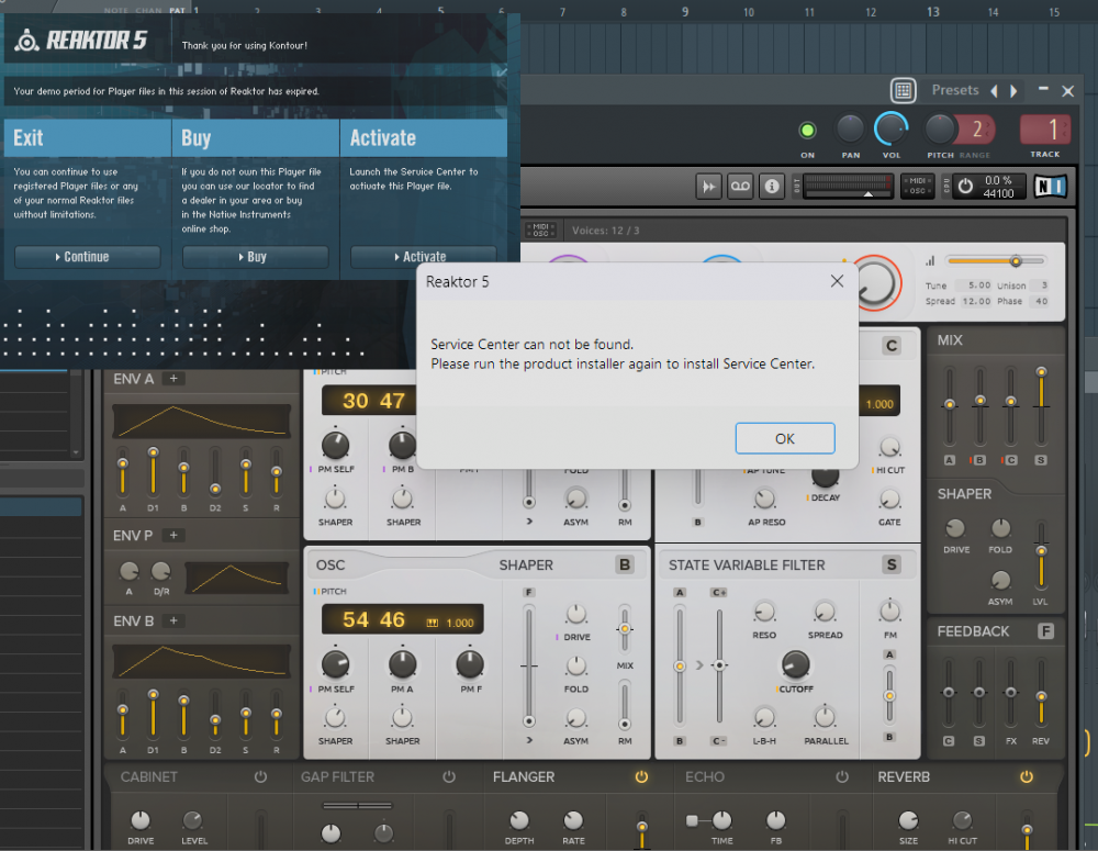 I have activated reaktor 5 in the past. I have since bought reaktor 6, but I loaded a track in which uses reaktor 5, and the window opens with it, to activate it. When I click activate, a window opens saying "service centre not found. Please run the product installer again to install service centre"