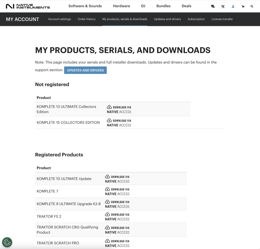 I tried to access my products on the MY PRODUCTS, SERIALS, AND DOWNLOADS page in my NI Account in order to register new products.
