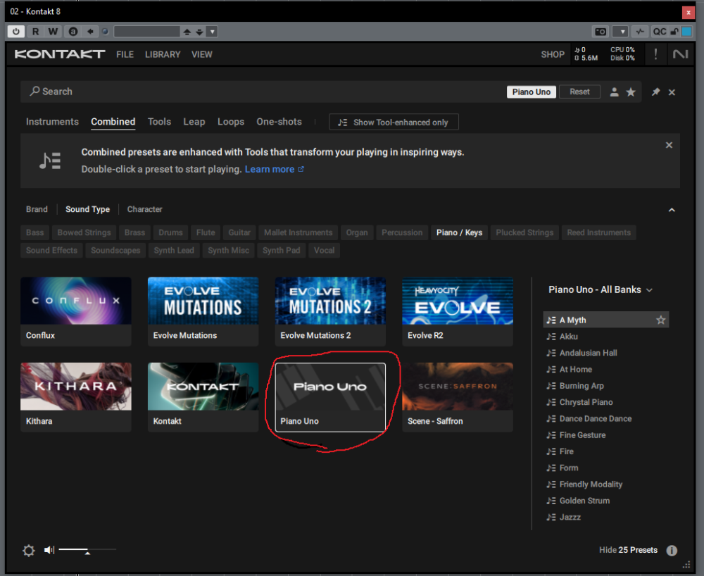 I have Kontakt 8 and I can't seem to remove Piano Uno from "Combined". This means that any instrument I add, has Piano Uno with it. I am new to this, so forgive me if the question is naive. Any help is appreciated.