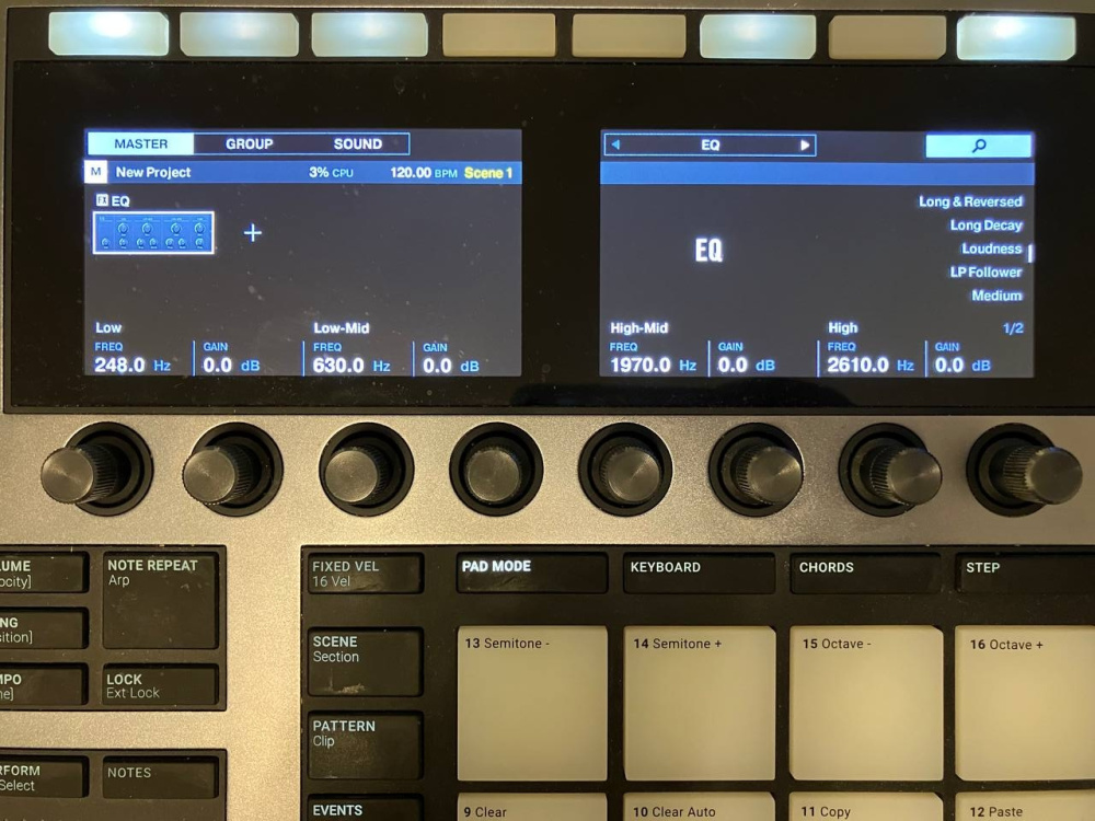 on Maschine +, in standalone mode, the earlier Maschine software was different. With Maschine 3 software, when I create a new song, the first thing that I do is to select the Master channel and put some effects. The first one I put is an EQ. Before, when I clicked on the EQ, it would allow me to access only the specific presets for the EQ. Now, the top button on the right opens up ALL the presets, and this is very confusing. As you can see from the photo, it shows me reverb presets that are not specific to the EQ. Hopefully I have been clear enough. Thanks for any help.
