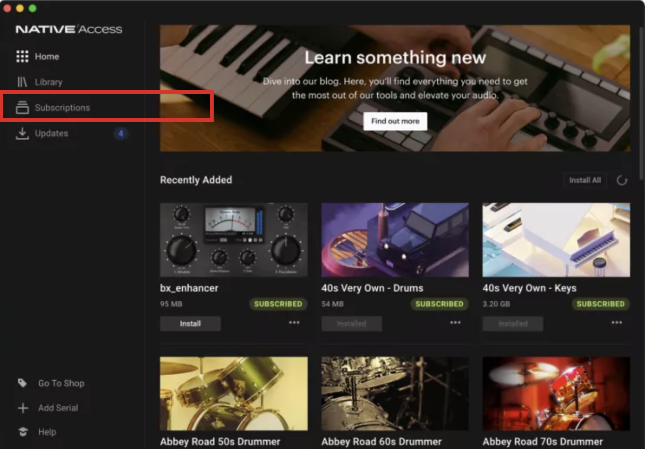 I've paid for a Music Suite Pro Subscription but the subscription tab does not appear in Native Access. (Native Access 3.20.1)