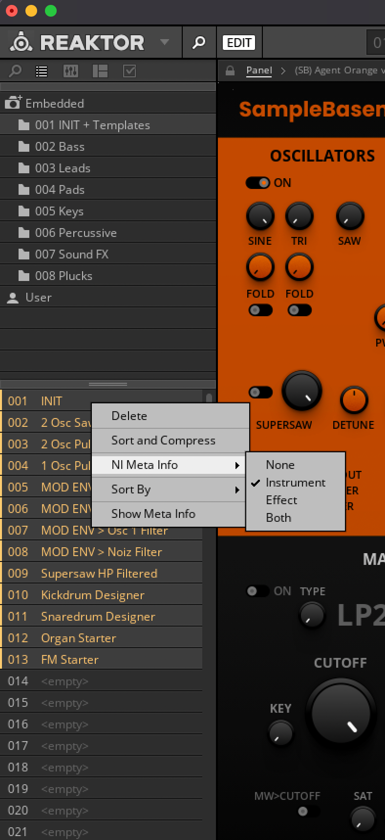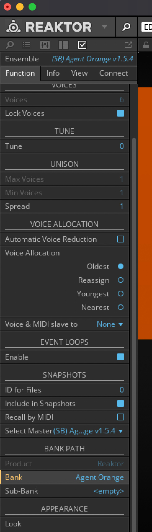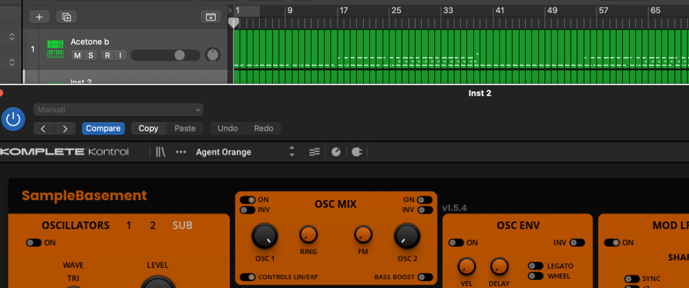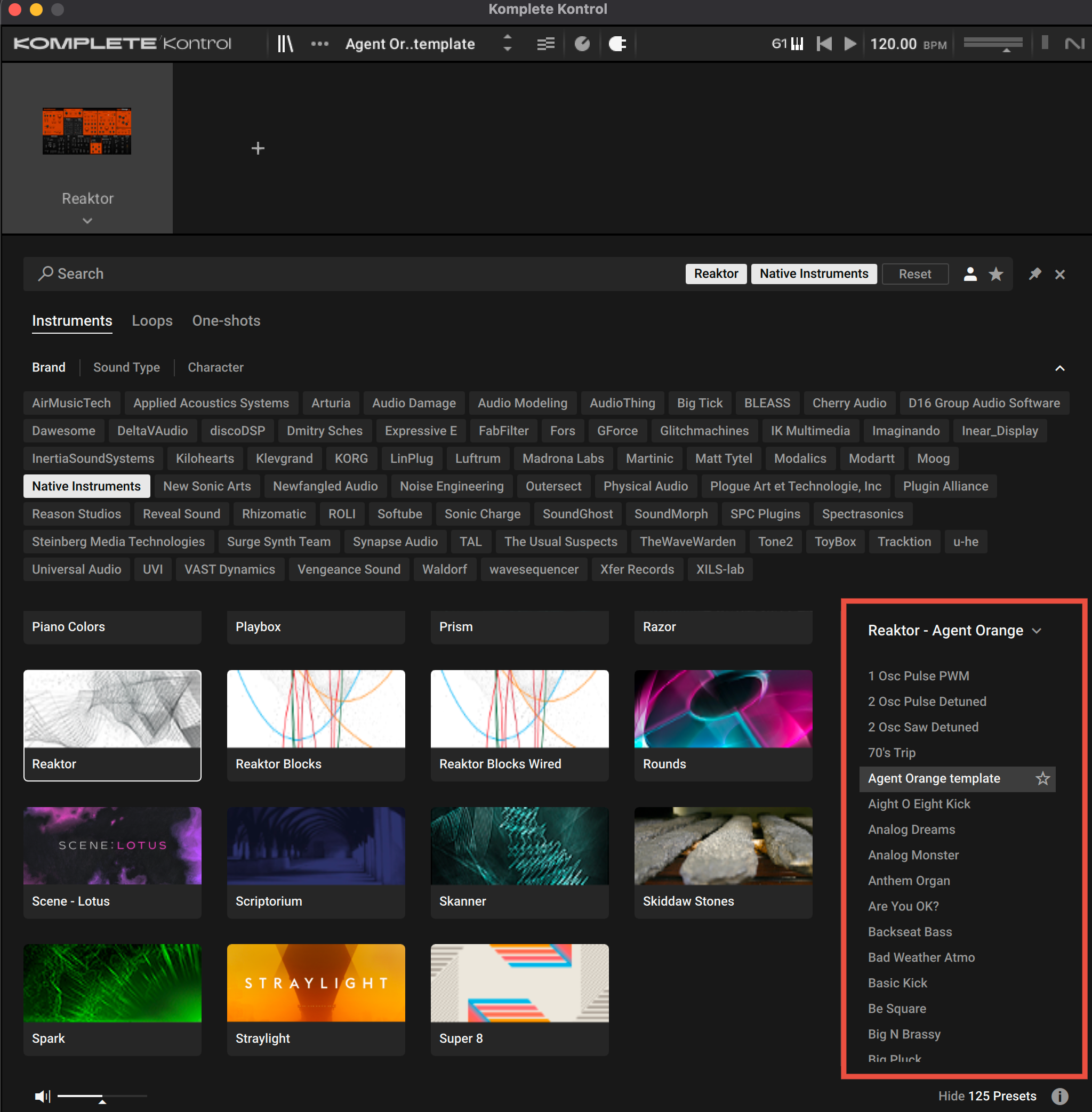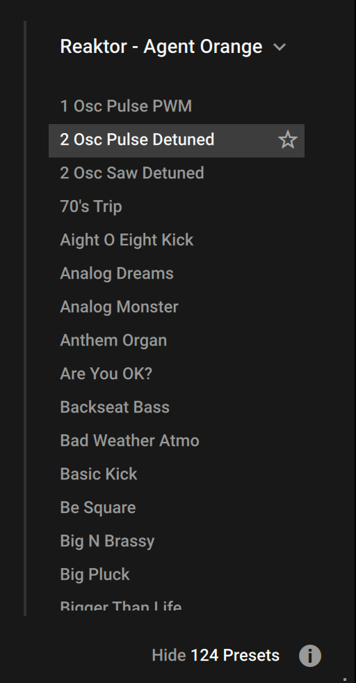 So I'm in Logic, and I have a Reaktor user ensemble loaded into Komplete Kontrol (so I can use my KK S61's knobs to control it, rather than just Reaktor because the S61 knobs don't seem to work that way), and I wish to scroll through the presets tagged in the ensemble - in this case Agent Orange v1.5… but I CAN'T! Whenever I try scrolling through them using the window - reading 'Agent Orange' in the image - it changes ensembles rather than the ensemble's presets. I'm looking for a way to do what I wanna do. Help?