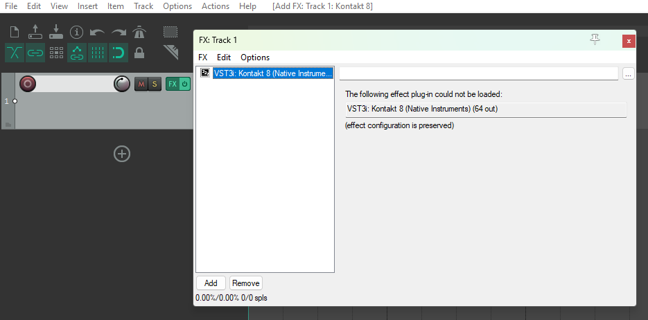 Since one mounth, in Reaper, each time I want to open in FX Kontakt 8, Kontakt 7 or Massive X, there is the error message "Effect configuration is preserved". I did lots of stuff to correct this (check installation paths, reinstall both Kontakt 8 and Reaper, check that vst3 file is well located, testing if Kontakt 8 and Reaper worked well alone, etc…), but there is allways this problem. I need to work and it's more and more anoying for me. Could someone help me ? Thx !