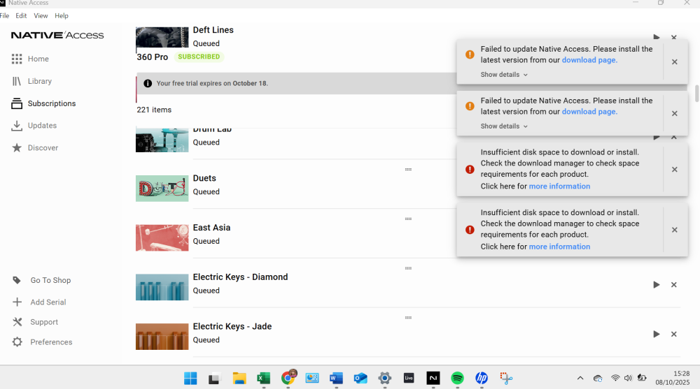 Dans un premier temps, j'ai commencé par télécharger la totalité des articles de l'abonnement sur Native Access 2 (ceux en MB et en GB) mais j'ai reçu automatiquement un message d'erreur m'empêchant de poursuivre la procédure de téléchargement "Espace de disque insuffisant pour télécharger et installer vos produits…"