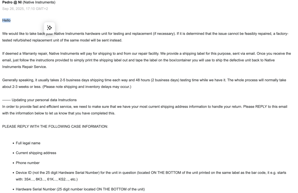 I've sent x2 Traktor Kontrol S8 to the repair center and after almost 3 months they disappeared. NI doesn't answer my emails and I'm left without my two main controllers which happened to break on the same day without any alert by just staying off on a shelf. I'm stuck with an s5 but it's a shame how NI is treating this "Low Priority" requests. I'm so disappointed and sad to be tangled in this ecosystem, it's difficult to leave as a working mobile dj, but I'm feed up. Anyone has any experience with the repair center?