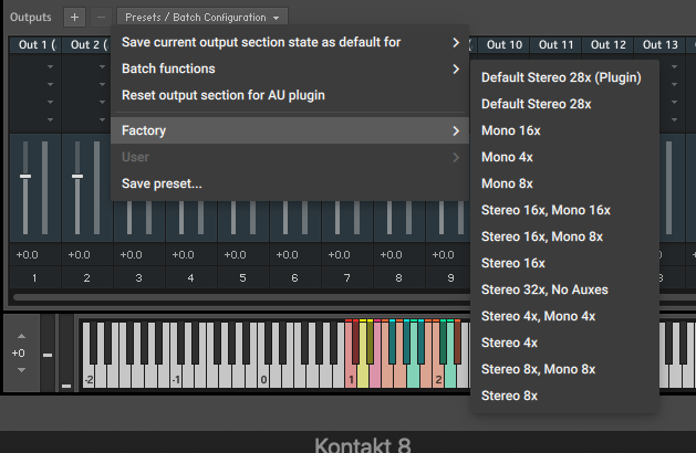 In Kontakt you can set the number of channels in the mixer view. Hit F10 to switch to classic view. Click the mixer icon bottom right. Under the Presets/Batch dropdown click Factory then select the output channel configuration you want.