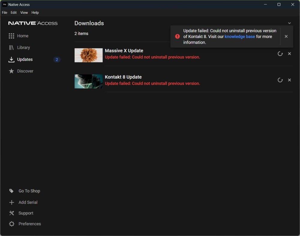 EVERY new update of Kontakt 8 and Massive X in Native Access fails like this. Look at the screenshots. Why? Even if I complexly uninstall both items and reinstall, the next update will turn out the same. :-/