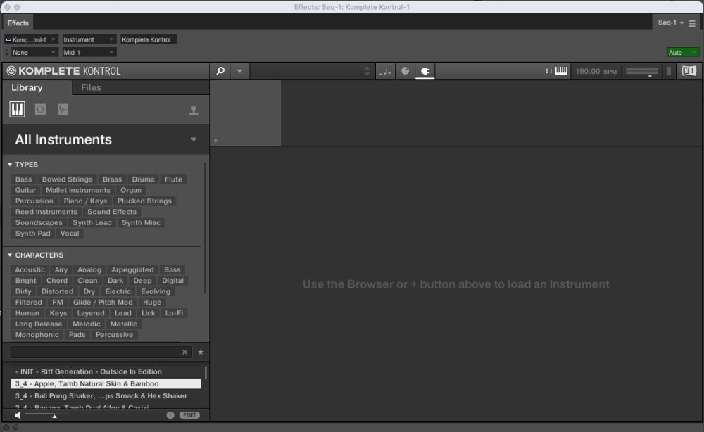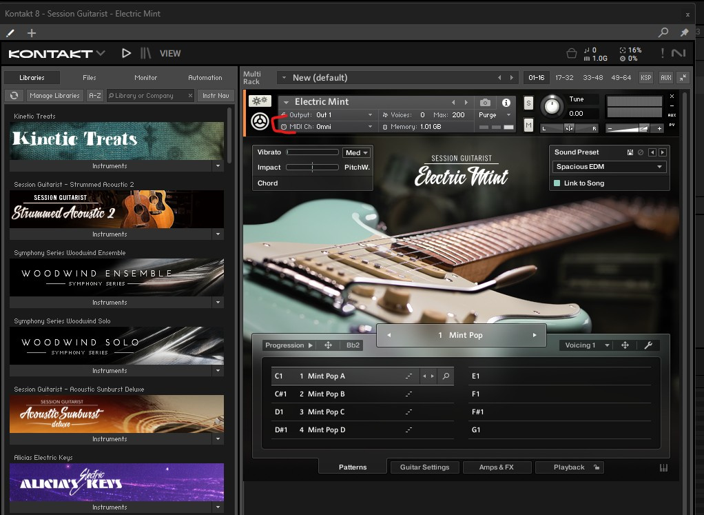 I got Session Guitarist Mint loaded in my DAW (Digital Performer) and created a new Komplete Kontrol track and midi to go with. I make my track ready to record and can see the signal on my fader but hear no sound. In the section where the different variations of this instrument are (chord or single note) , when I click on them I CAN hear sound. But when I play my keyboard and see the signal is received and moving the fader there is no sound.