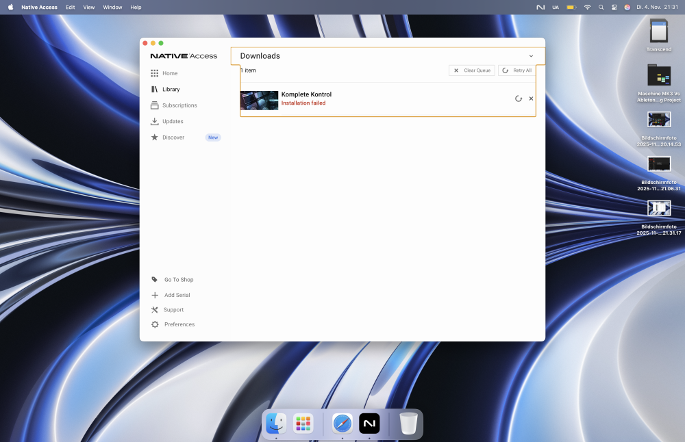 The problem with downloading the Komplete Kontrol could be a simple one of Native Access having failed to do so and then N.A. are not able to recover from that , I only know how to fix that on PC since I have no Mac.