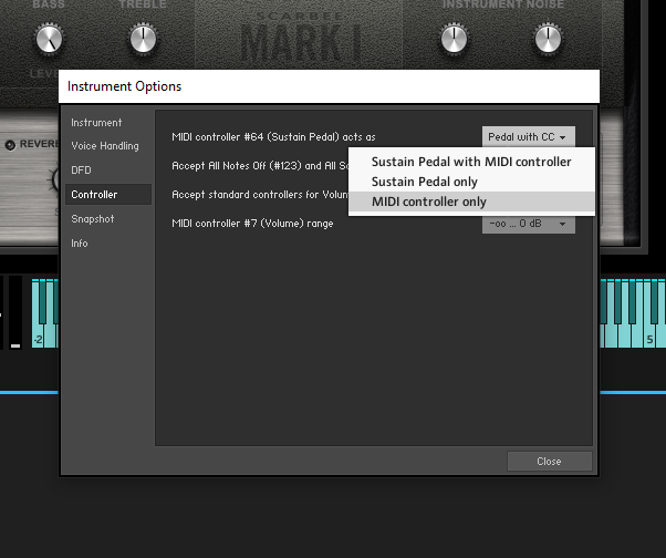 Then change the "MIDI controller #64 (Sustain Pedal) acts as" setting to "MIDI controller only" and it should fix the issue;