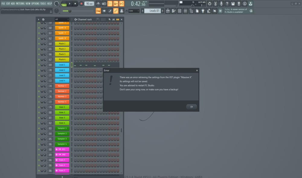 The new update for Massive X is causing FL Studio to throw error messages. This is caused by creating Automation Clips of Massive X. It doesn't happen all the time, but when it does, I only find out when I try to save the FLP Project File.