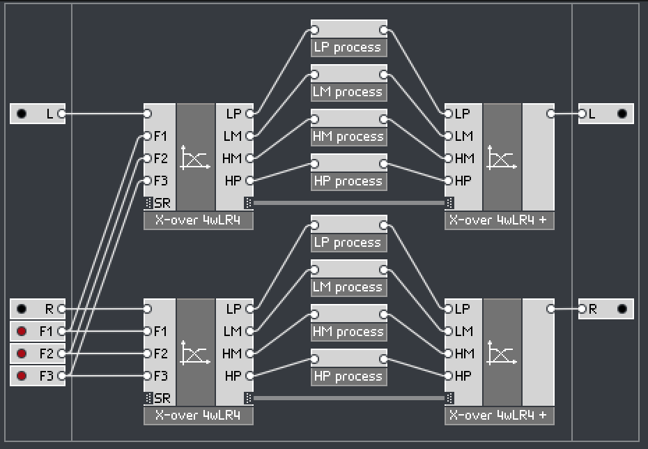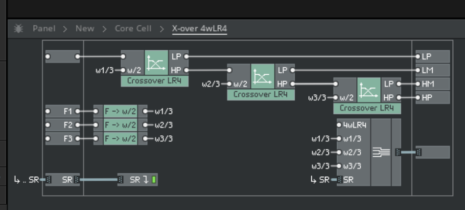 Then I tried building a system with 4-pole Linkwitz-Riley crossover Core Macros, but as far as I can tell the factory Core Macros allow to build 2-way and 3-way crossfaders, not 4-way ones.