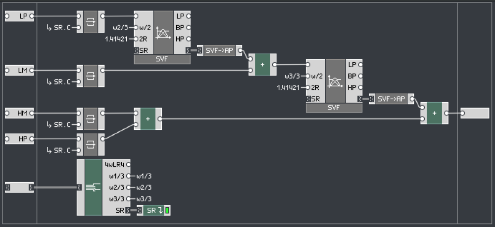 I would like to split a broadband signal into 4 frequency bands in order to add harmonics differently on each band (using the same distortion unit built with Reaktor Core for each frequency band, but with different distortion levels), then recombine the four bands without encountering phase issues.
