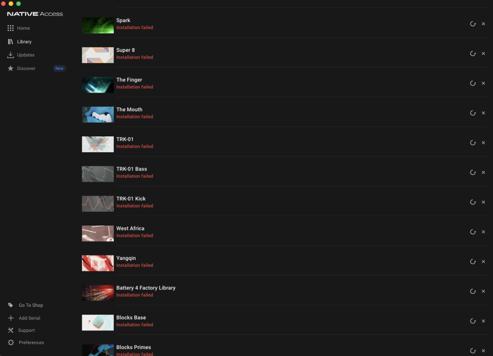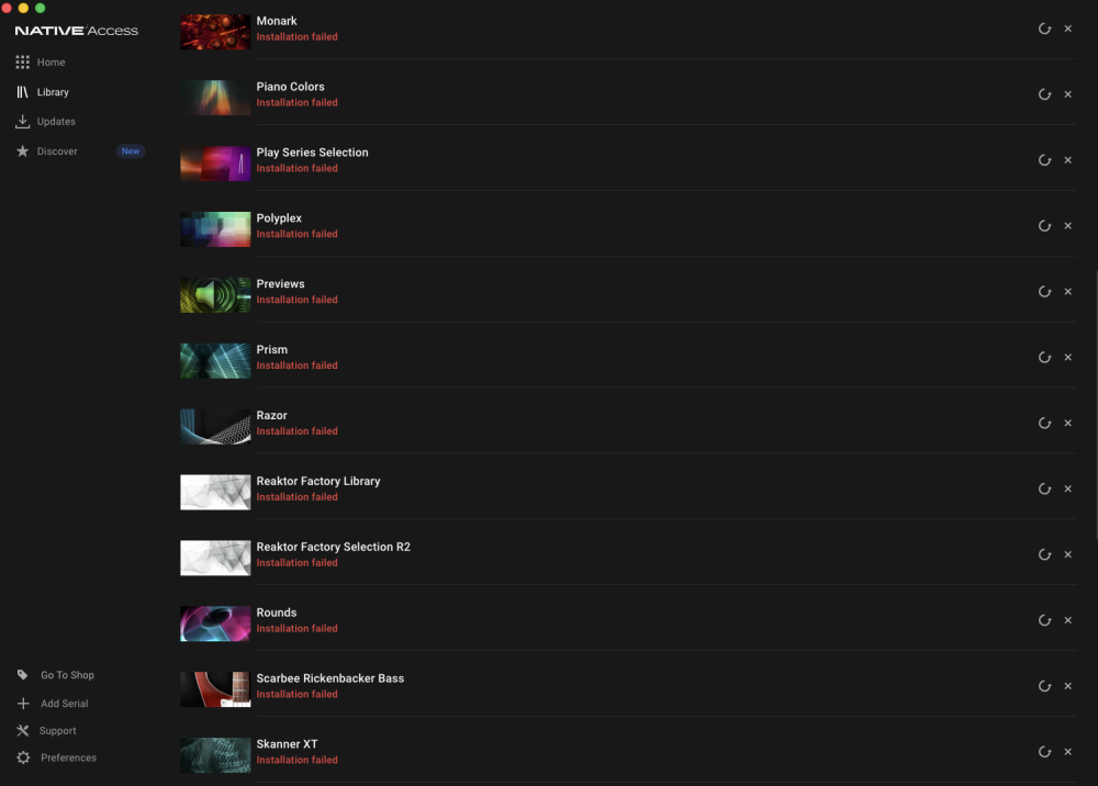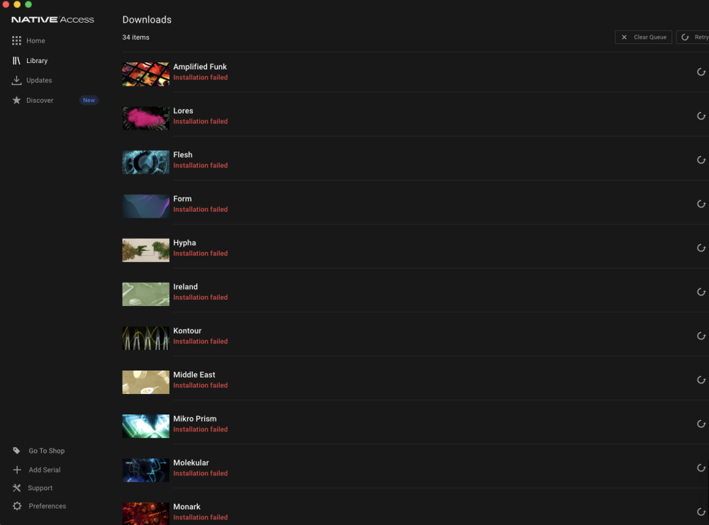 I’m having a problem with 34 specific products that show an error in Native Access / the Daemon. What’s strange is that the error only happens with those products, while everything else installs and works normally.