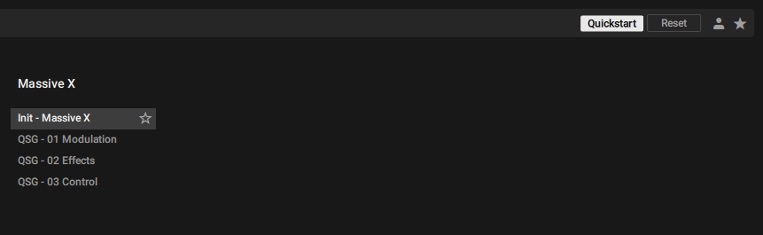 I always use the Init Blank - Massive X preset to begin patching stuff. Now it seems to be gone and I only have the Init with the routing pre-initialized and macros all set up which is incredibly frustrating to have to undo. In the Quickstart tag I only have the four presets shown below.