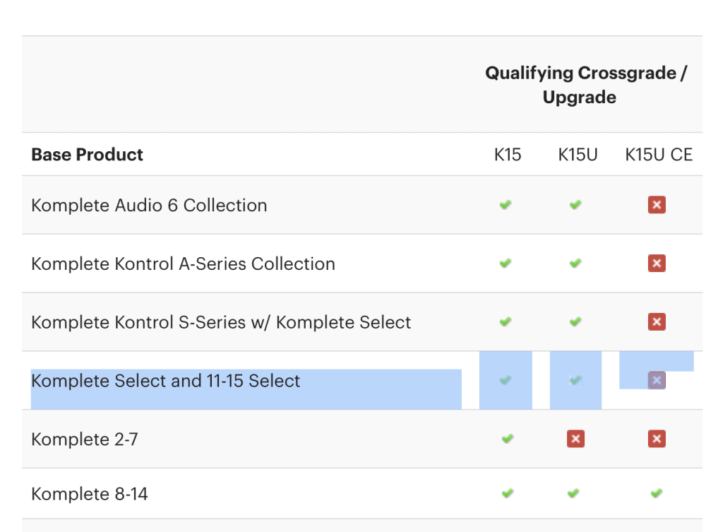 I checked the upgrade requirements for K15U on the official website and found they include Komplete Select and 11-15 Select,and I own KOMPLETE 15 SELECT Band, so why am I still getting the ‘missing the base product’ message?