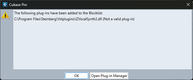 I was reviewing the insulation, and when I started Cubase Pro 15 (latest version) the VocalSynth 2 plugin was highlighted on the Blocklist.