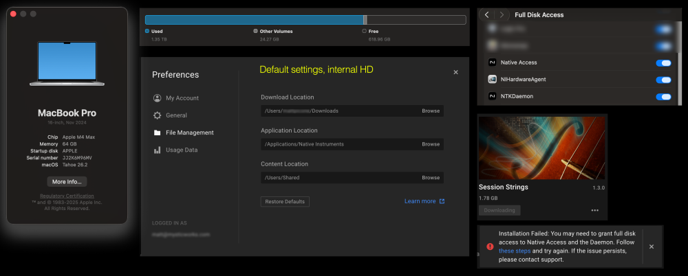 For weeks now, I’ve been trying to install libraries to a local disk with plenty of free space — after giving full disk access to every NI app that could possibly need it.